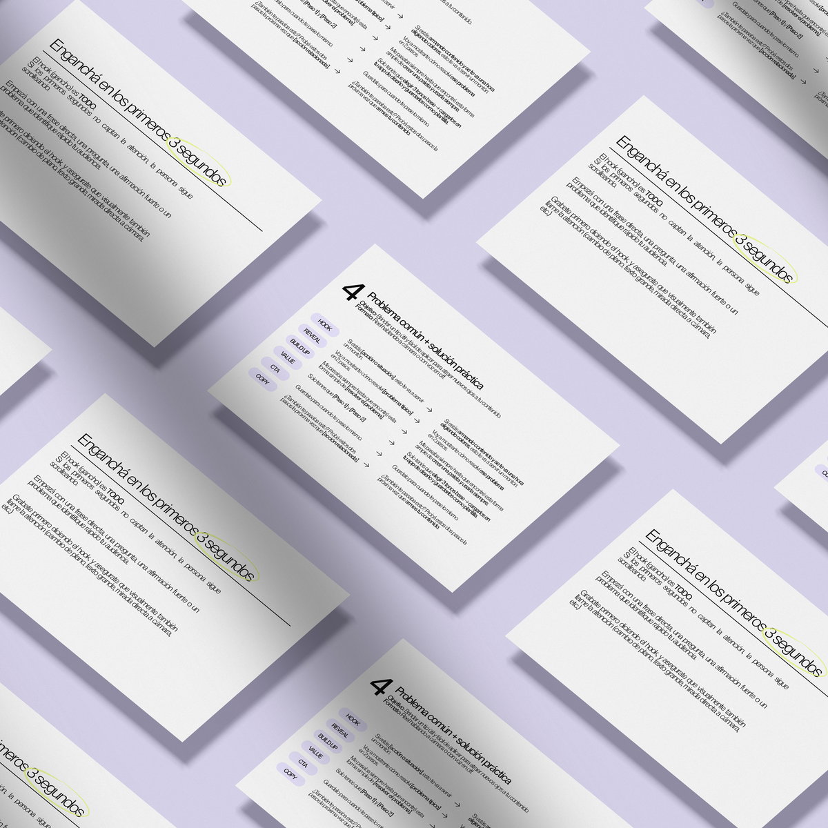 Un Ebook con 20 guiones divididos según tus objetivos de contenido: visibilidad, comunidad, conversión y posicionamiento. Listos para grabar y conectar con tu audiencia desde el primer segundo.