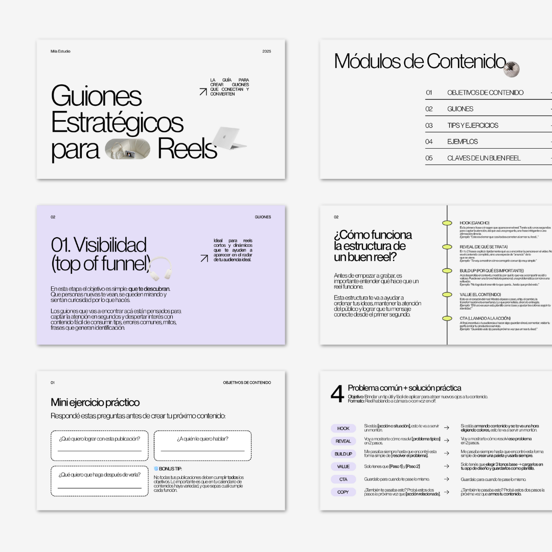 - 20 guiones para reels, divididos según objetivos de contenido: visibilidad, comunidad, conversión y posicionamiento. Cada guion sigue una estructura clara (hook, reveal, build up, value y CTA) con espacios para personalizar según tu marca.