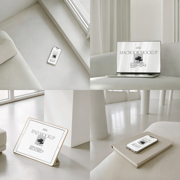 Este kit incluye Mockups de dispositivos como iPad, MacBook y iPhone, diseñados en un ambiente estético, moderno y cálido que realza la luz natural y la elegancia visual.