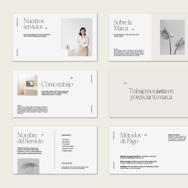 Con un diseño moderno y totalmente editable en Canva, esta plantilla te permite estructurar tu presentación de servicios de manera clara, destacando lo mejor de tu marca y facilitando el proceso de cotización con clientes.